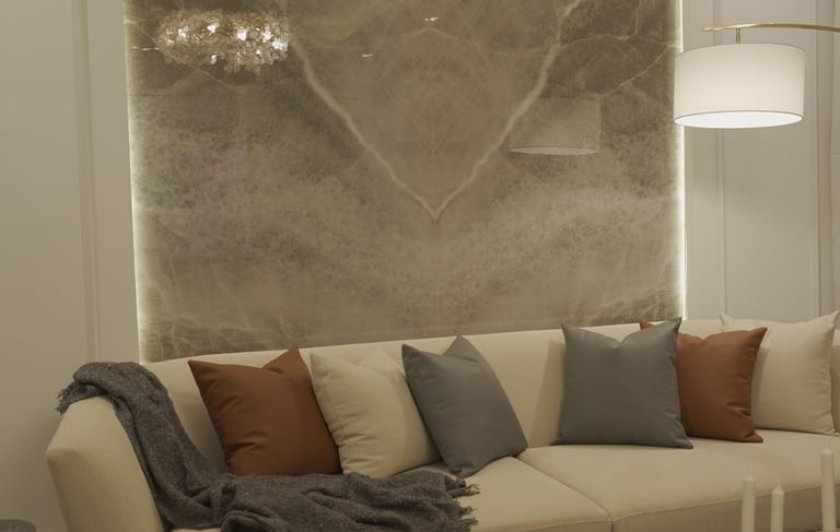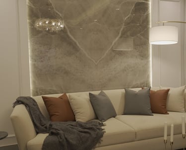 This contemporary home blends clean architectural lines with warm, inviting interiors. The exterior features a modern façade with sleek geometric forms and subtle lighting that highlights the landscaped garden. Inside, soft neutral tones, curved furniture, and elegant textures create a calm, luxurious atmosphere. Thoughtful touches—such as artistic wall patterns, layered lighting, and refined décor accents—bring harmony to every space. The rooftop terrace completes the design with a stylish open-air lounge, offering a perfect retreat with serene views and sophisticated outdoor comfort.